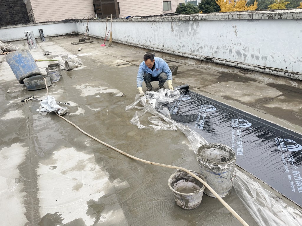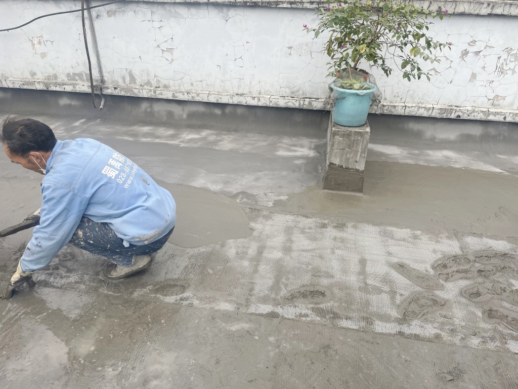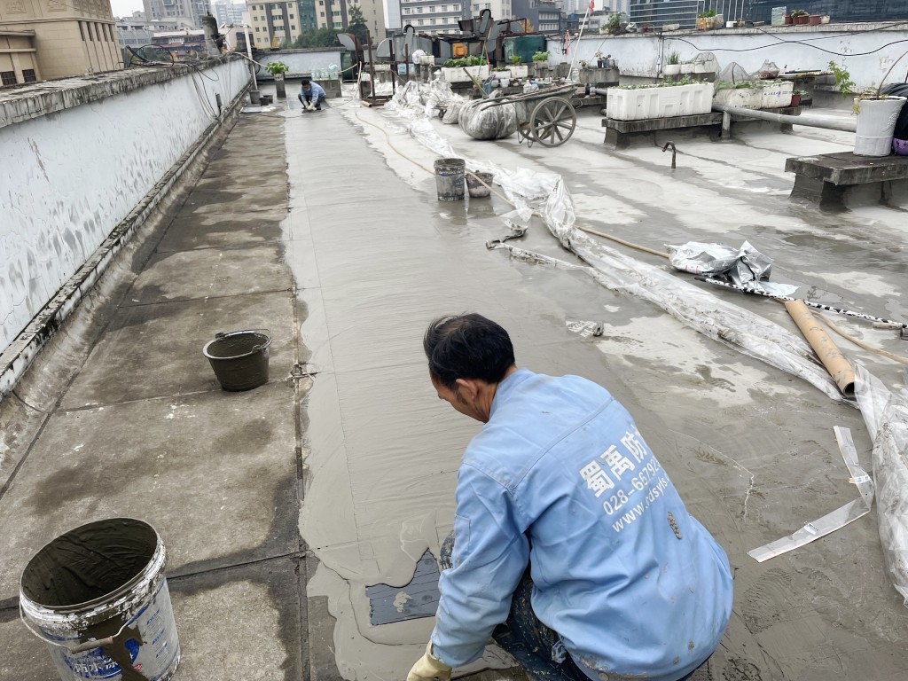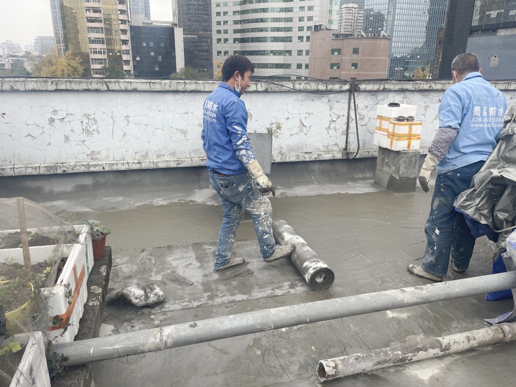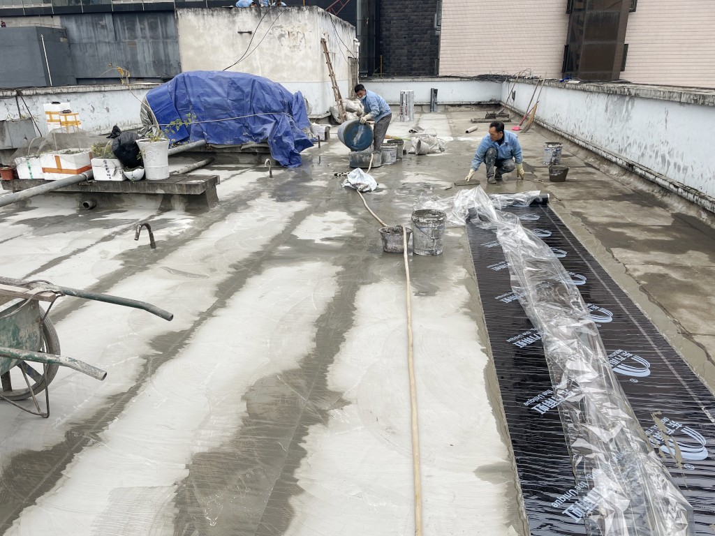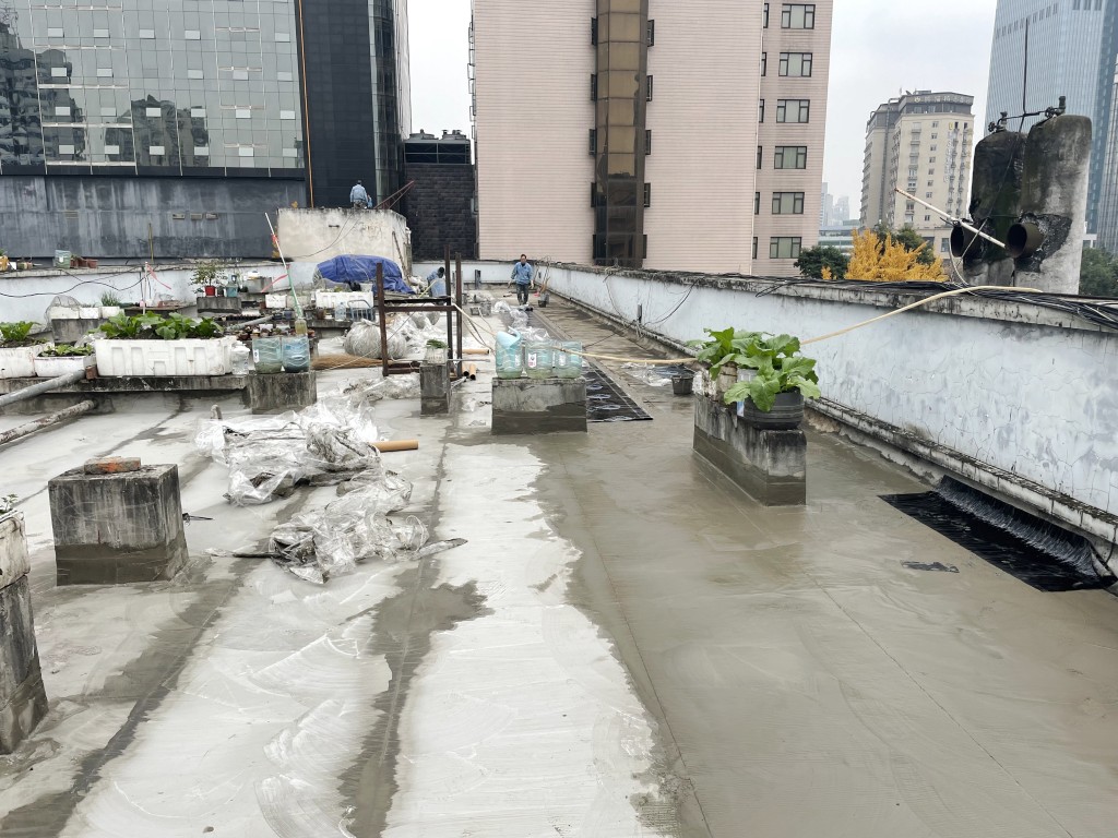 我公司采取的施工方案為:先將地面原有改性瀝青防水卷材清理掉,然后在地面及墻面滿鋪一層濕鋪防水卷材(濕鋪防水卷材可避免水在防水卷材底下到處竄的情況),防水卷材施工后在表面做一層砂漿保護層蓋住防水卷材,讓防水卷材免受紫外線照射,延長防水卷材壽命,最后將施工產生的建渣搬運下樓并清運出場。